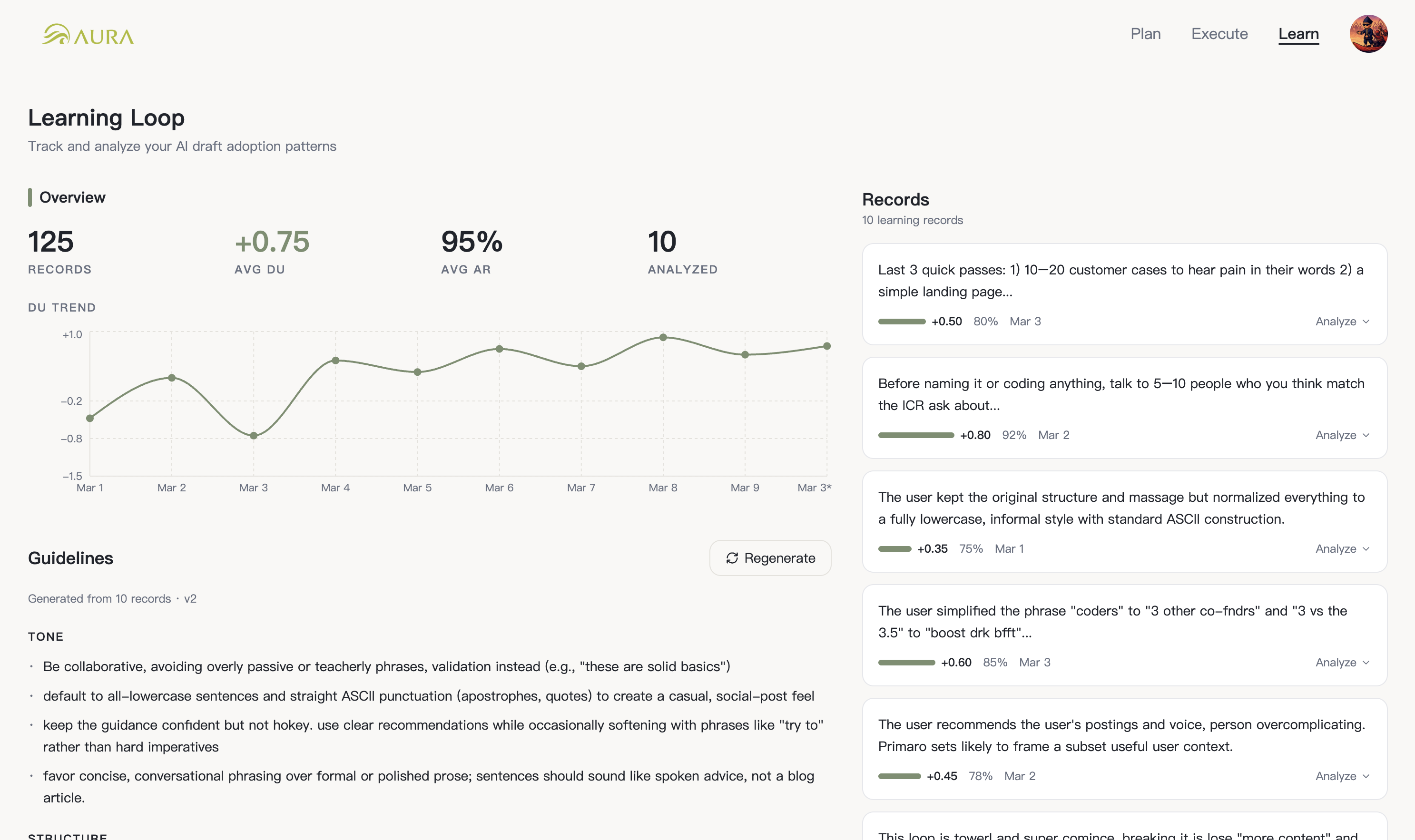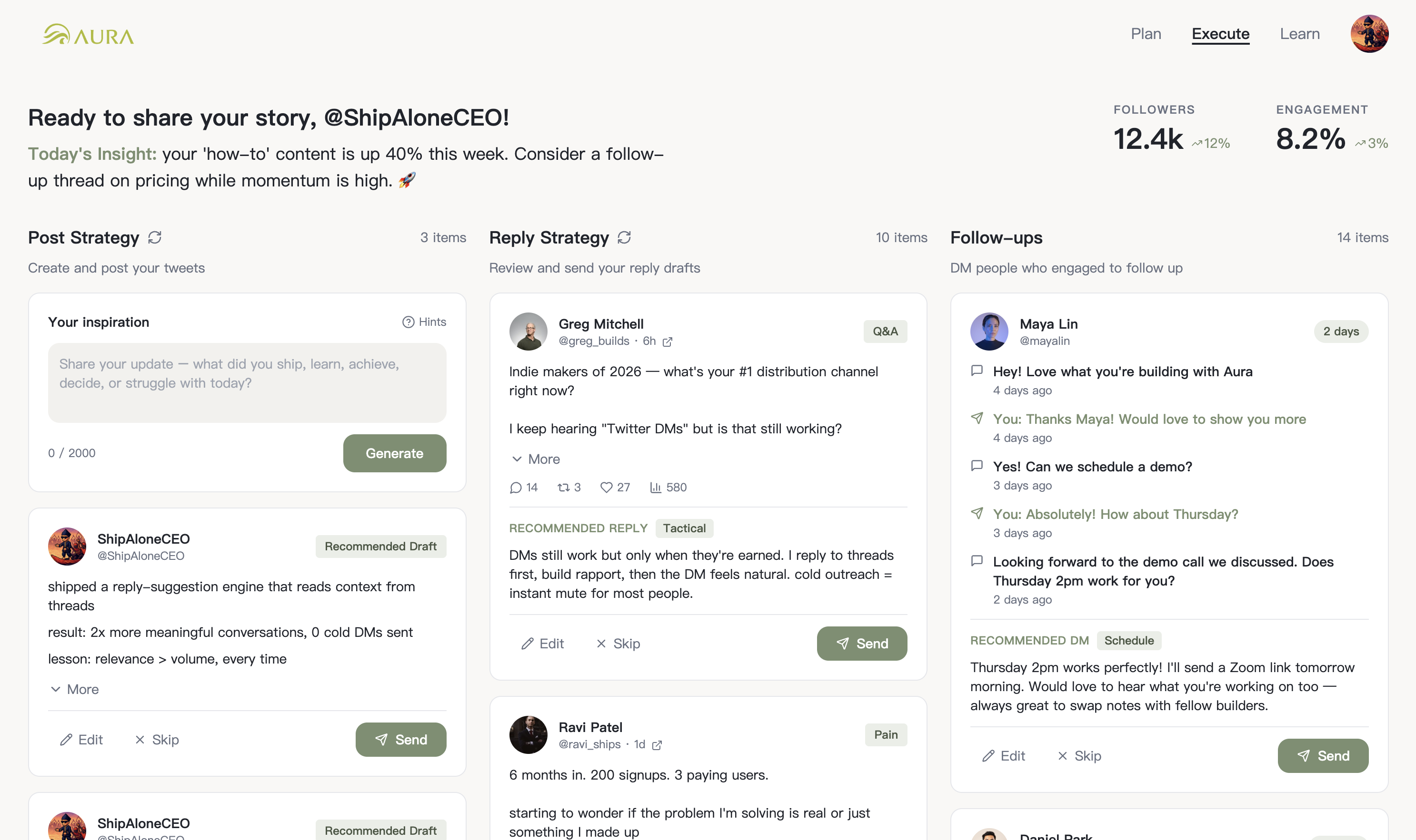 Writing posts, finding the right people to talk to, engaging with them, Aura handles it so you can keep building.