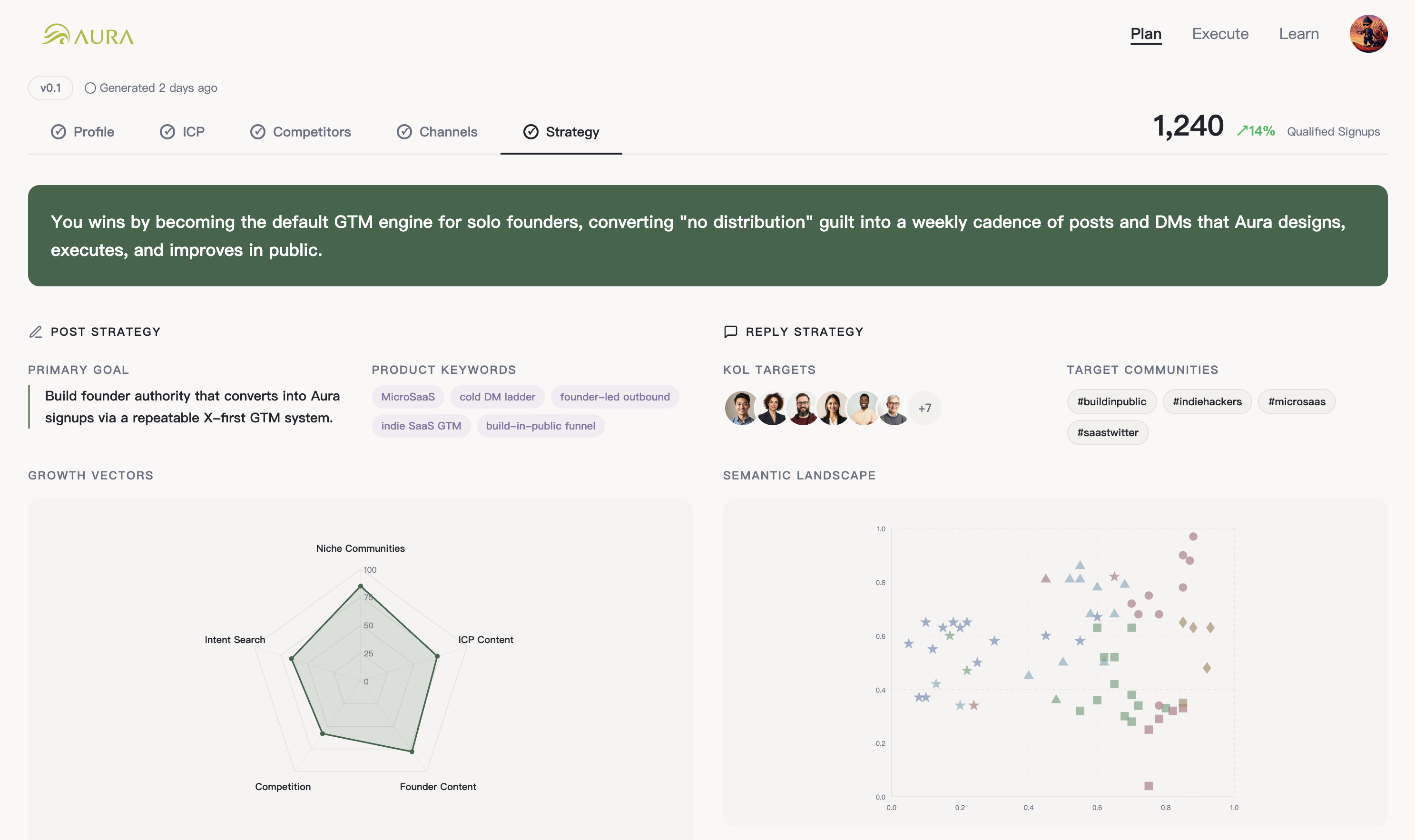 Aura runs your growth across four systems: strategy, content, outreach, and a loop that learns from what works.
